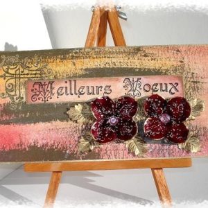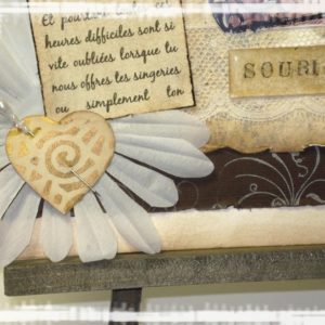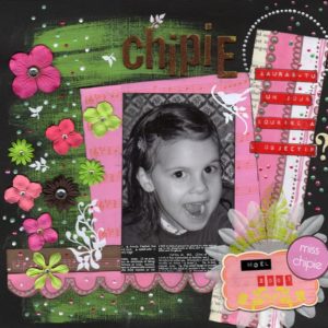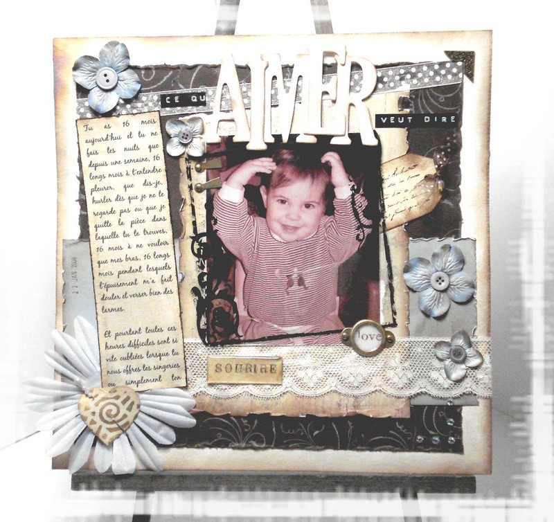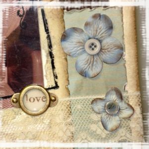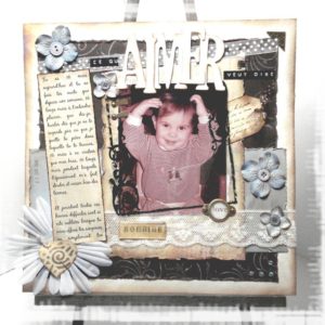 côté technique rien de particulier, peinture accrylique en fond, peinture 3D, papiers Betty d’Elsie, étiquette color conspiracy, dymo, hambly ruban autocolant 7 gypsies des fleurs, des strass et des peel off.