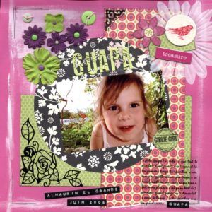 Ce jour-là, comme elle aime à le dire, Ana a attrappé la fièvre scrappeuse ! «C’est devenu obsessionnel. J’étais en congé maternité et pendant quelques jours j’ai passé mes journées et mes nuits à parcourir les blogs pour m’émerveiller devant les créations des unes et des autres. Je pensais scrap, je mangeais scrap, je dormais scrap (ça n’a pas changé d’ailleurs!). J’ai découvert les cours en ligne de bernadine et commencé à acheter du matériel : j’avais trouvé mon idée de cadeau pour Noël pour les mamies : des petits cadres avec les photos des petits-enfants. Ma première page je l’ai faite en janvier 2007, un scraplift fou que j’ai tenté et je n’ai plus arrêté.» |