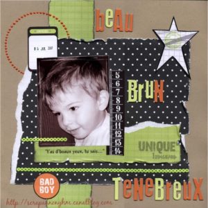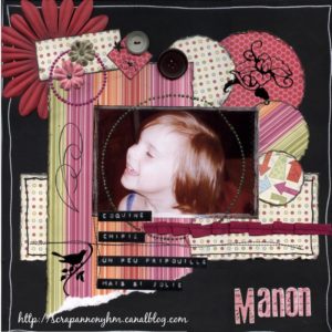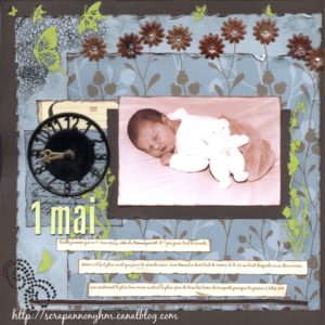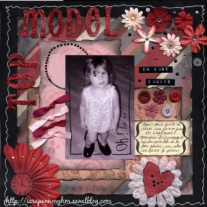 Bon, oui, je sais, je n’ai pas de style, mais bon, finalement je ne suis pas attachée à un style de scrap, du coups pourquoi m’enfermer dans une tendance… j’aime bien explorer d’autres univers 🙂