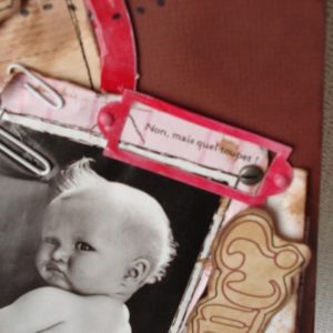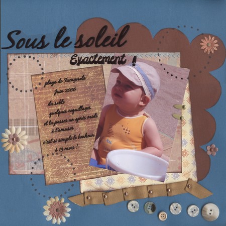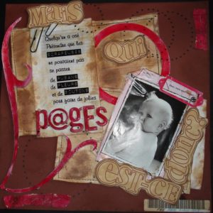 après avoir réfléchi à la teinte j’ai opté pour le brun. Bien sûr mon DH a commencé à essayer de me convaincre de changer de teinte de faire dans le printannier etc… après avoir regardé mes papiers je me lance sans convition dans le rose… puis je reviens au brun. Et… je suis super contente de ma page, pour moi c’est la plus belle page que j’ai fait pour le moment et j’en suis d’autant plus fière qu’elle n’est pas un scraplift mais bel et bien une page sortie de mon imagination.