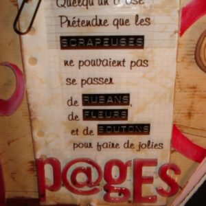 Je suis devenue scrap addict, maintenant il n’y a plus le moindre doute, mais aussi blog addict, je prends un plaisir immense à découvrir les nouvelles création des unes et des autres et c’est grace à ces créations que j’ai trouvé moi même la créativité. Merci 🙂