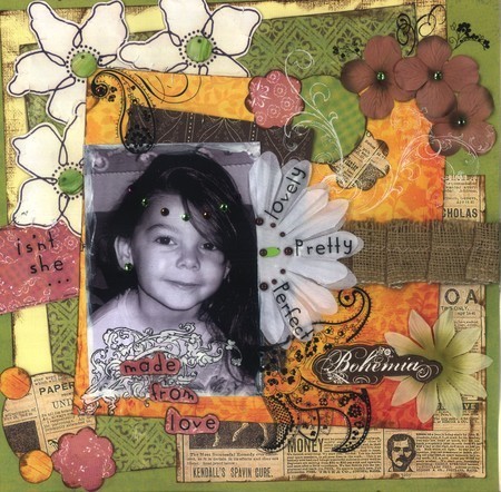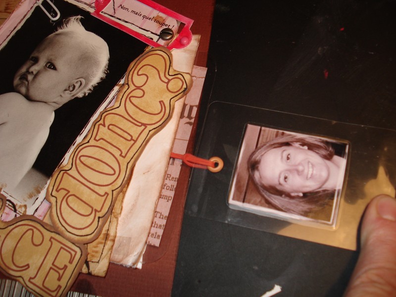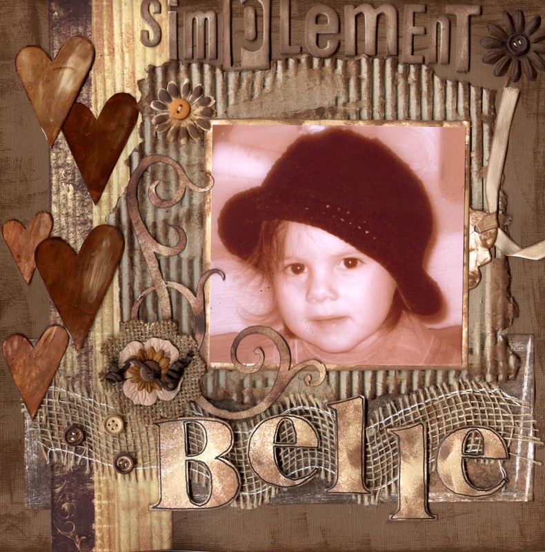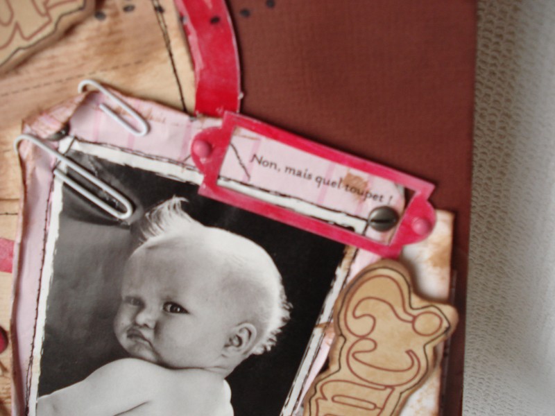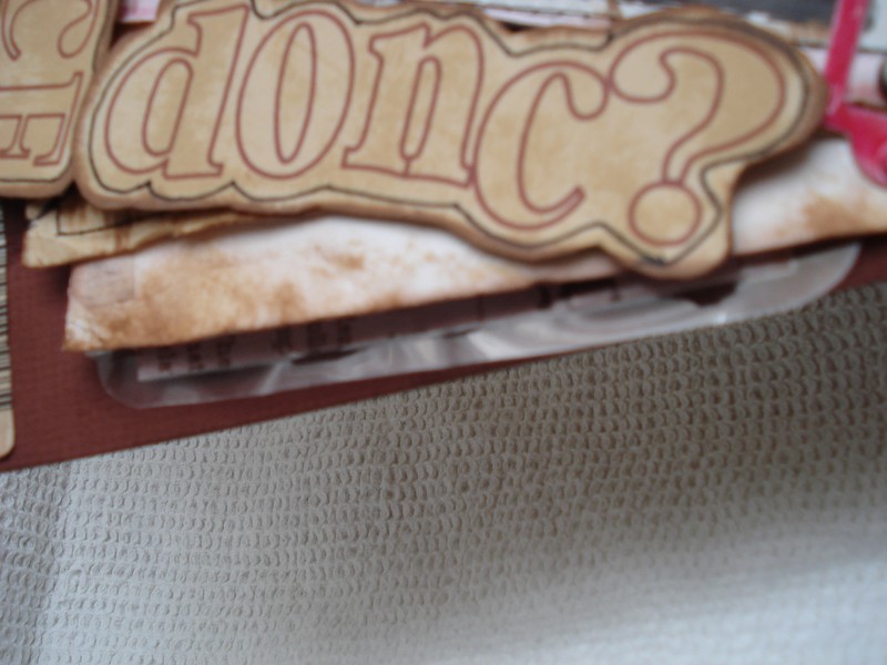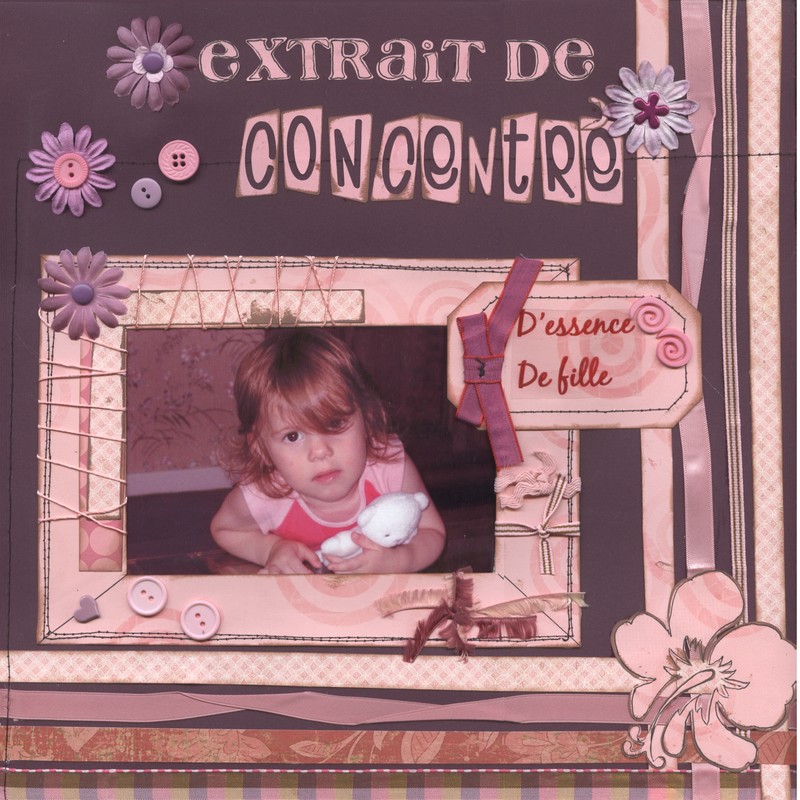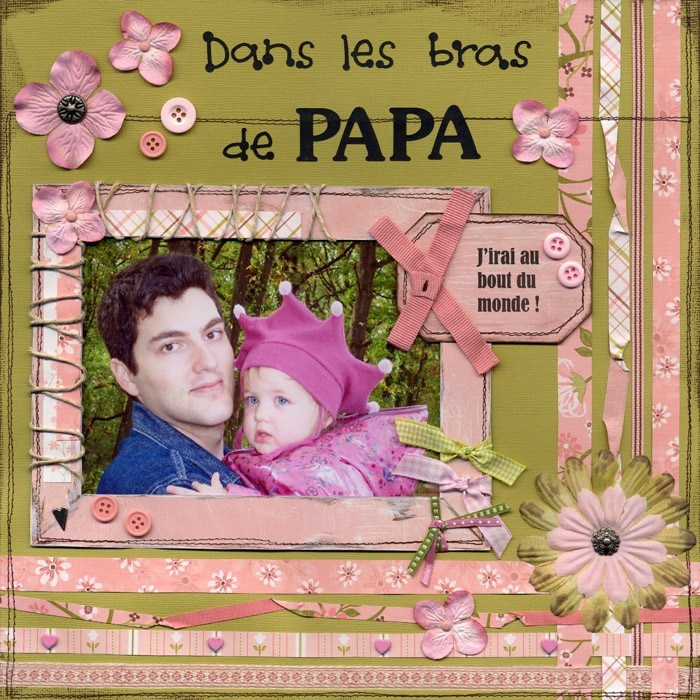 après avoir réfléchi à la teinte j’ai opté pour le brun. Bien sûr mon DH a commencé à essayer de me convaincre de changer de teinte de faire dans le printannier etc… après avoir regardé mes papiers je me lance sans convition dans le rose… puis je reviens au brun. Et… je suis super contente de ma page, pour moi c’est la plus belle page que j’ai fait pour le moment et j’en suis d’autant plus fière qu’elle n’est pas un scraplift mais bel et bien une page sortie de mon imagination.