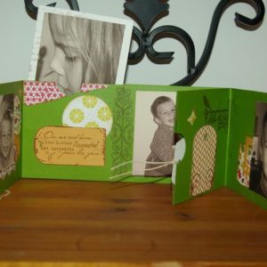 Seulement mon imprimante a eu la bonne idée de tomber en panne et je n’ai pas pu imprimer les photos (ben oui l’accident m’étant arrivé quelques jours avant l’atelier, j’ai paré au plus pressé) c’est donc un album sans photo que j’ai présenté à l’atelier :/