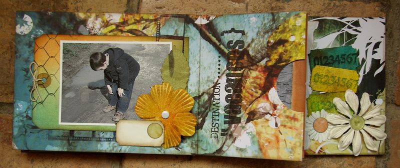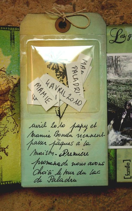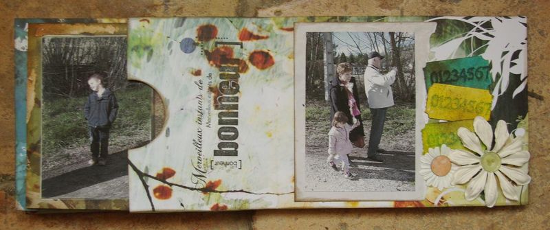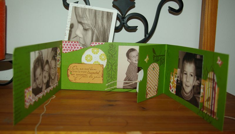 Seulement mon imprimante a eu la bonne idée de tomber en panne et je n’ai pas pu imprimer les photos (ben oui l’accident m’étant arrivé quelques jours avant l’atelier, j’ai paré au plus pressé) c’est donc un album sans photo que j’ai présenté à l’atelier :/