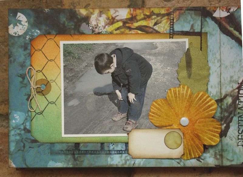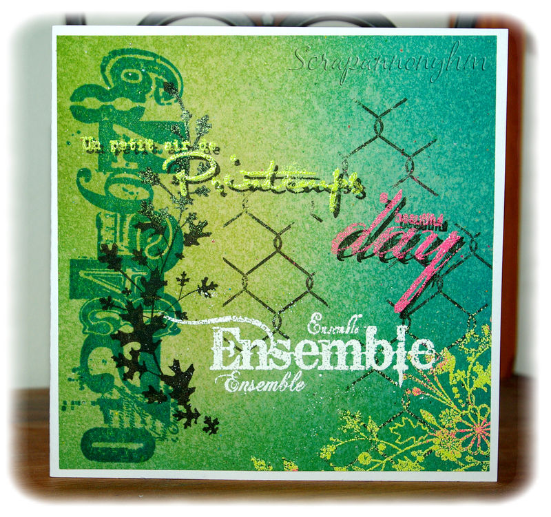 Une carte aux encres adirondack (décidément j’aime leur luminosité) tampons Tim holtz, Inkadinkadoo, florilège, Denim et les mots en scrap, poudres à embosser, Aladine et American craft.
