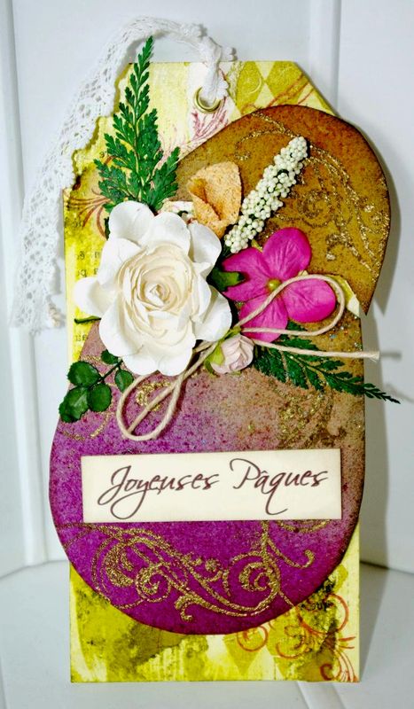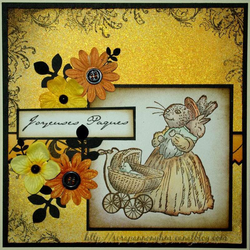 revenons en au scrap aujourd’hui une petite carte de pâques pour Katzekraft avec la fameuse maman Lapine que tout le monde nous envie 🙂 (au point qu’elle est en rupture de stock mais si vous demandez très gentiment je suis sûre que Béatrice pourra faire quelque chose pour vous).