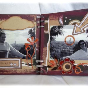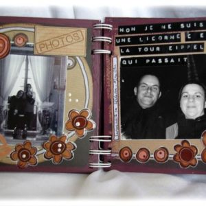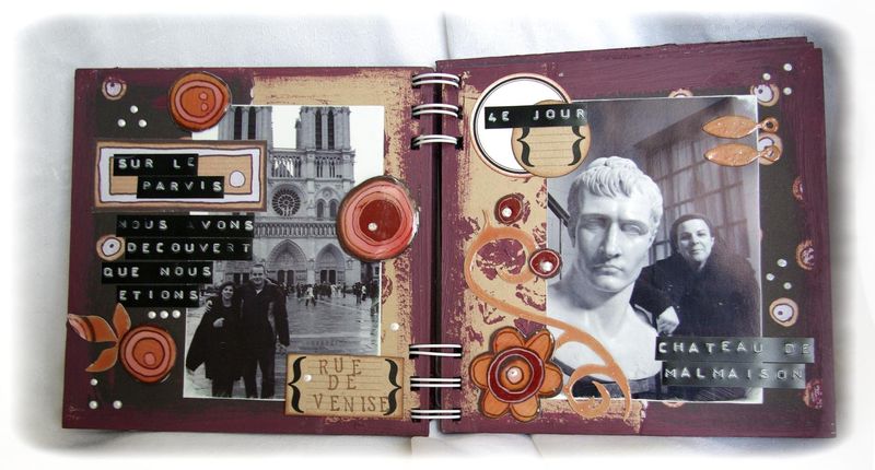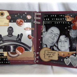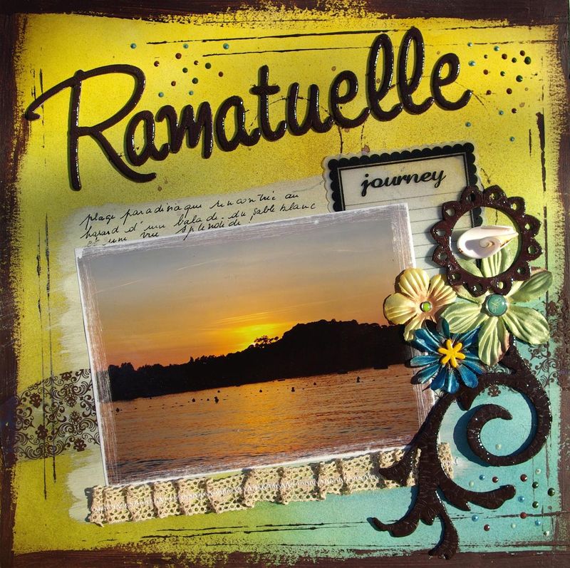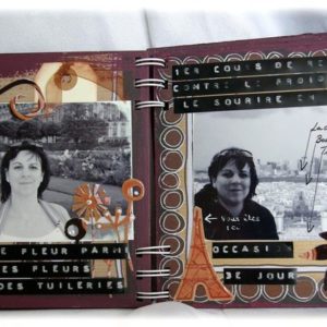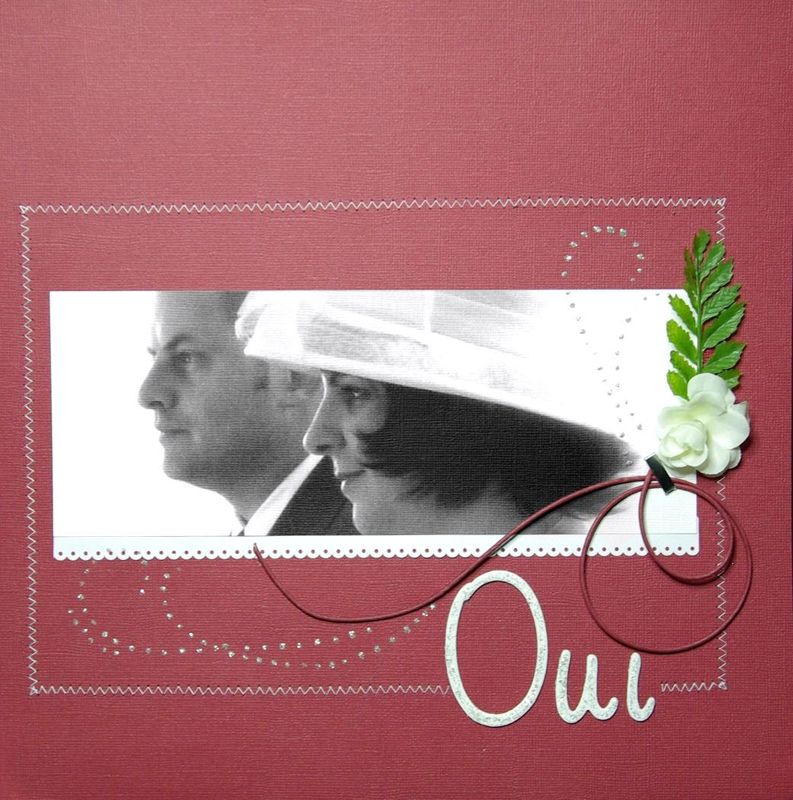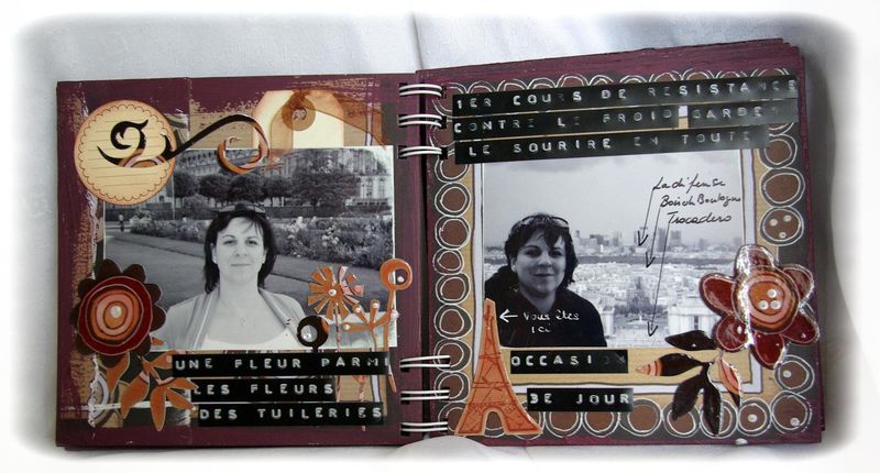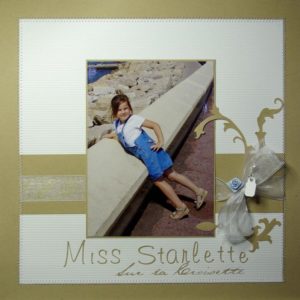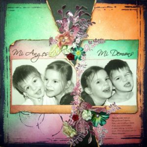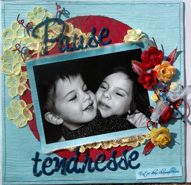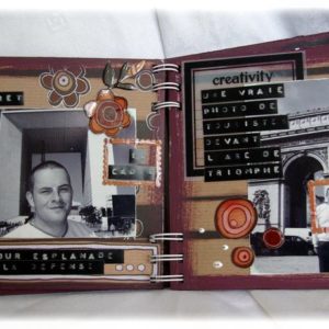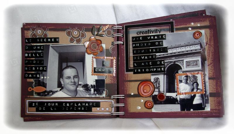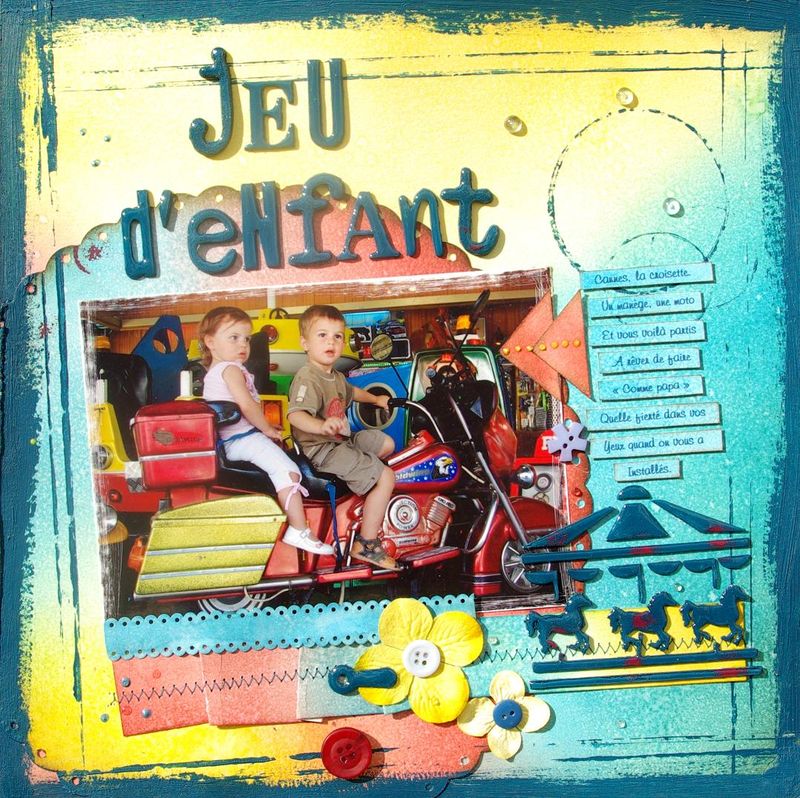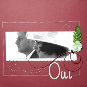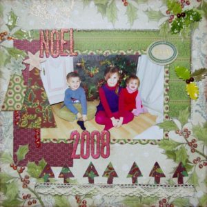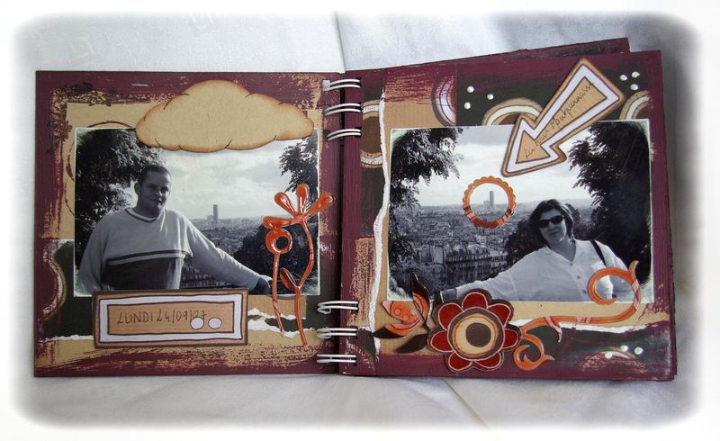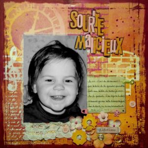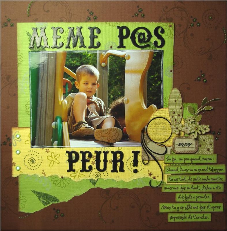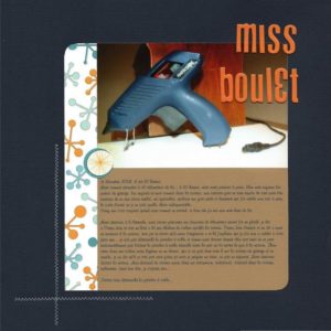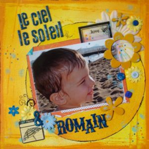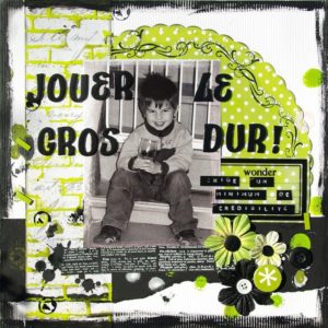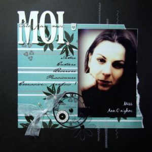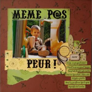 n’ayant pas les couleurs en papiers imprimés, j’ai cherché dans mes bazzill et tenté une page à la Sandra charbonnel, je ne suis pas convaincue que le résultat soit à la hauteur lol mais bon la page me plait quand même 🙂