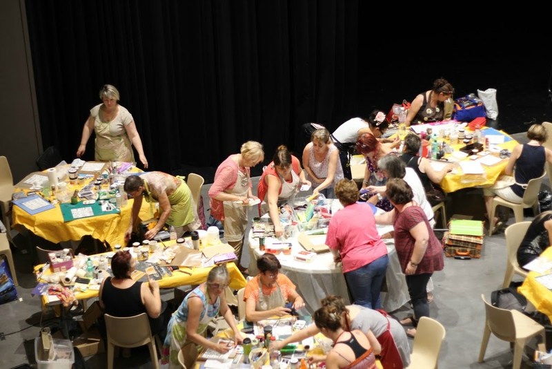 Pour ma part j’animais des minis ateliers d’une heure en alternant travail des Bistres/Brushos et travail des Izink Dye avec le flex plak de Laura Pack.