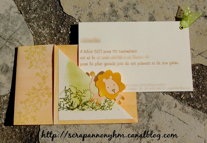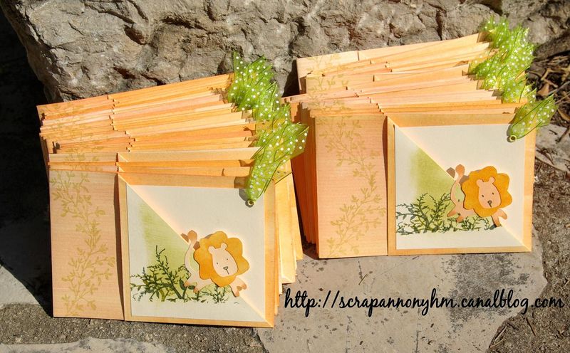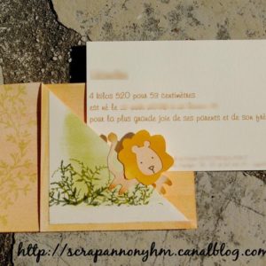Le petit Lion (puisque c’est un bébé Lion) est découpé au craft robo puis encré avec les distress, le petit champs est fait avec des tampons katzelkraft. enfant la frise sur le côté est également réalisée avec un tampon Katzelkraft.