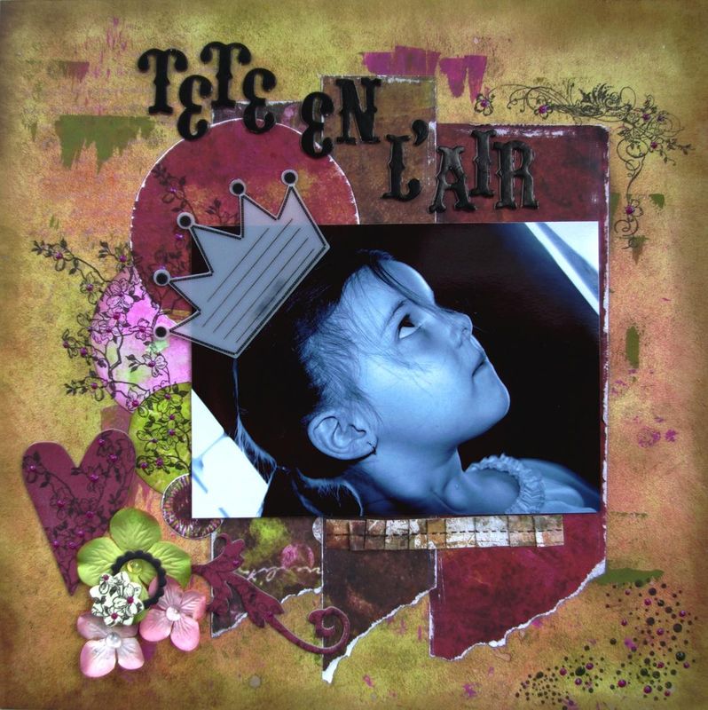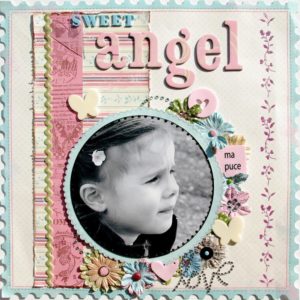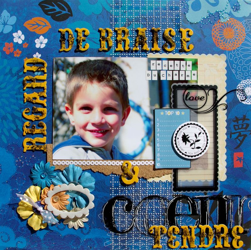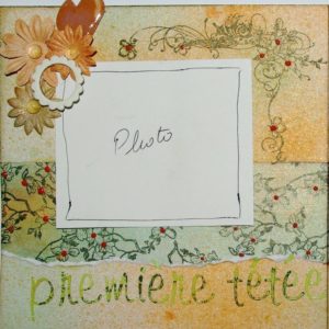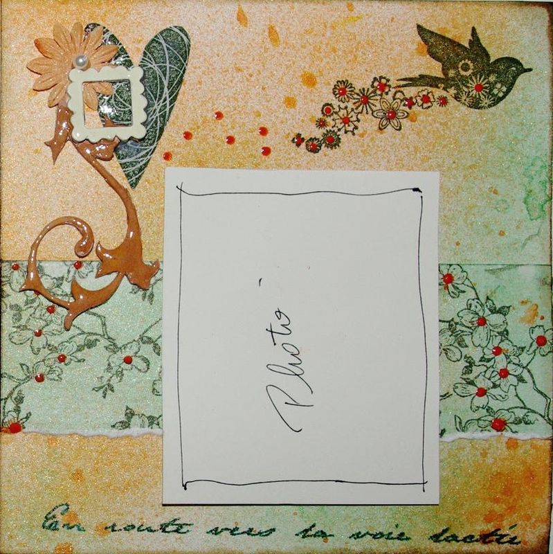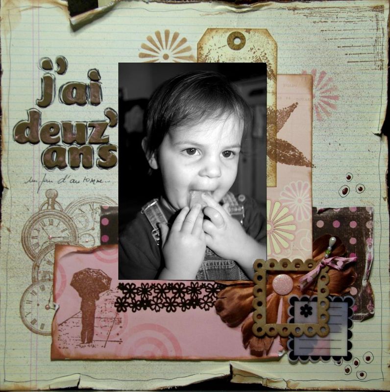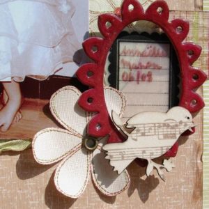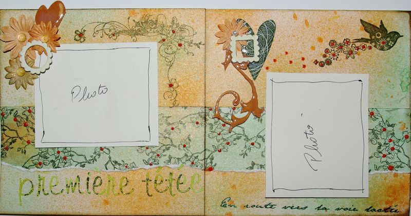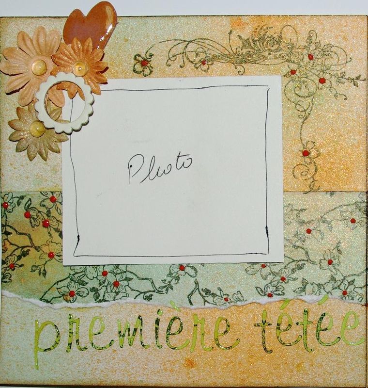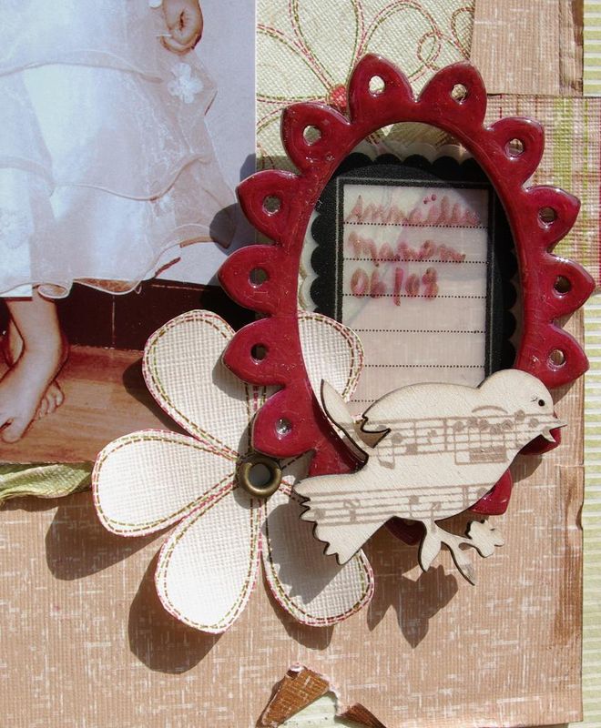 Pour le matériel, papier bazzill encré à la distress shabby shutter, papiers Daisy bucket collection Astor Park, les fleurs sont découpées directement dans le papier, chipboards alphabet American craft, petit oiseau en bois, étiquette et cadre maya road et l’arabesque est faite à la pate à pochoirs selon la technique gentiment expliquée par Maodren (qui fournit la fiche technique sur demande) à la différence que j’en encré et verni au pinceau, avec du glossy.