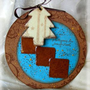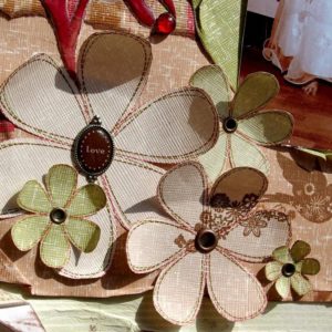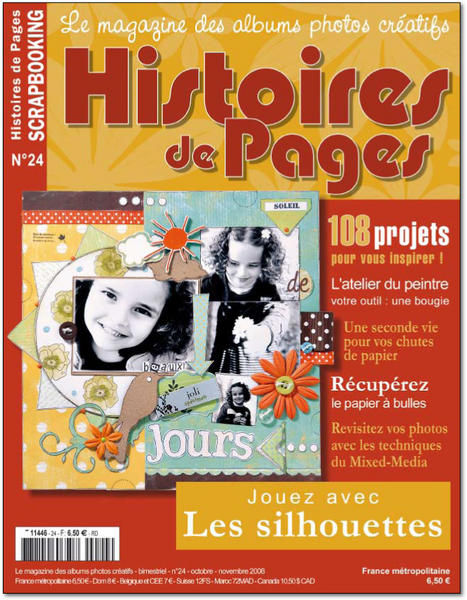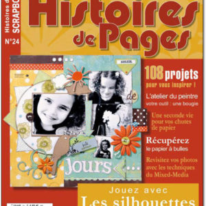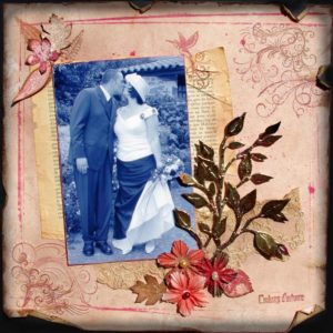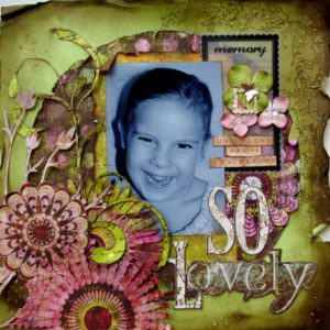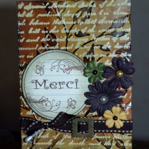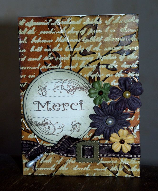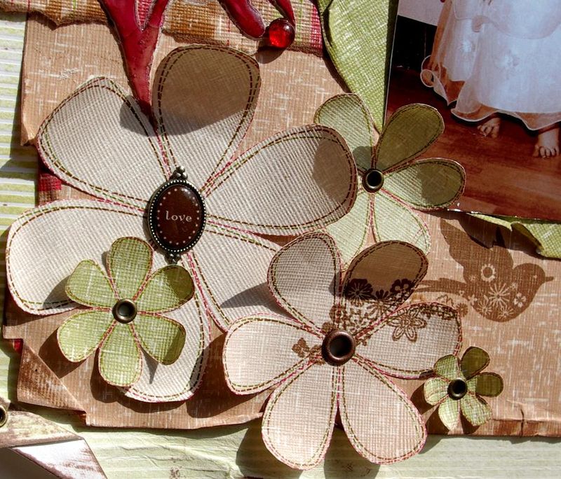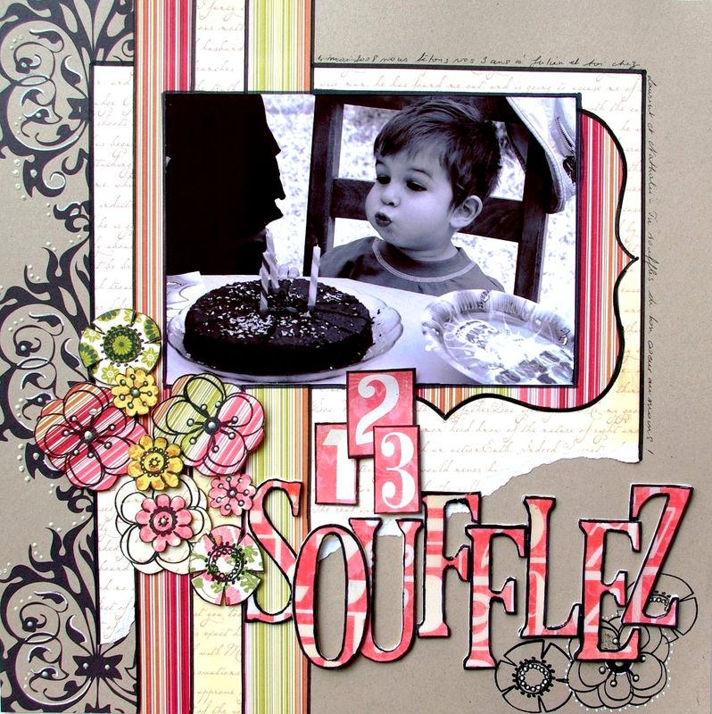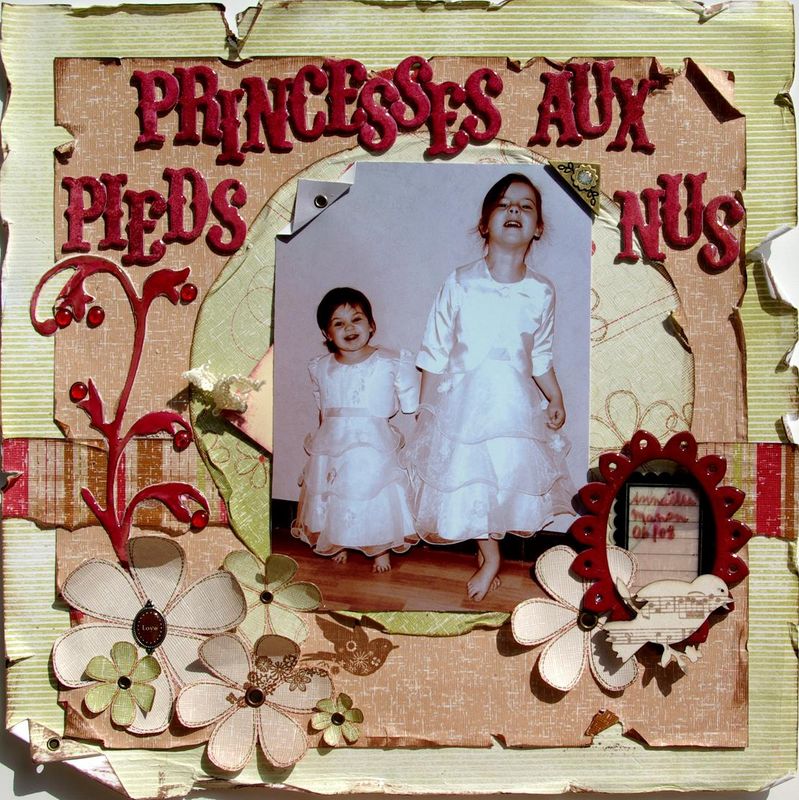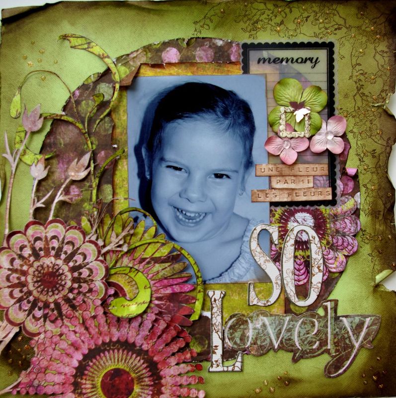Pour le matériel, papier bazzill encré à la distress shabby shutter, papiers Daisy bucket collection Astor Park, les fleurs sont découpées directement dans le papier, chipboards alphabet American craft, petit oiseau en bois, étiquette et cadre maya road et l’arabesque est faite à la pate à pochoirs selon la technique gentiment expliquée par Maodren (qui fournit la fiche technique sur demande) à la différence que j’en encré et verni au pinceau, avec du glossy.