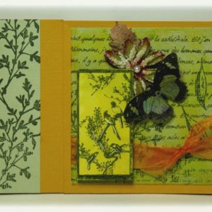 j’ai peinturluré le fond à l’accrylique, tampons Basic grey, chipboard et fleurs prima, transparent color conspiracy, cadre et étiquette maya road, un morceau de transparent Hambly (cadre sur la photo autour du bourdon) liège.
