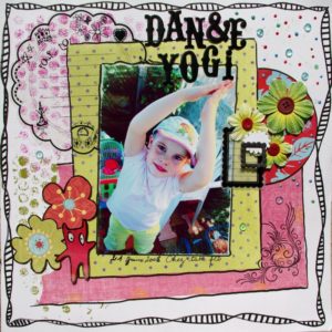 photo très saturée (bon, par rapport à ce que je fais d’habitude hein lol) papiers prima marketing, Rhonna farrer (je crois) scenic route, RDG, chipboards alphabet american craft, fleurs prima, étiquettes atilolou (la grande transparente en haut à gauche) et maya road (l’opaque) chipaboards maya road, perles de pluie, peinture 3D, Tampon Katzelkraft.