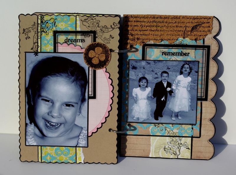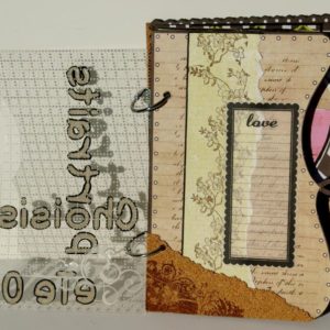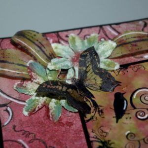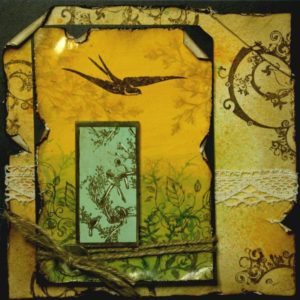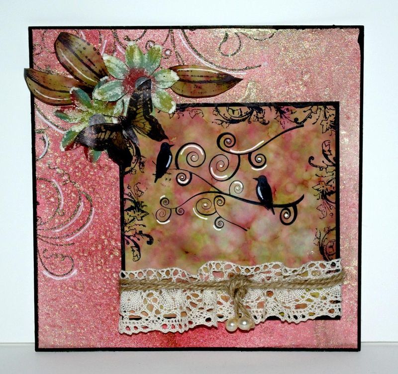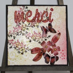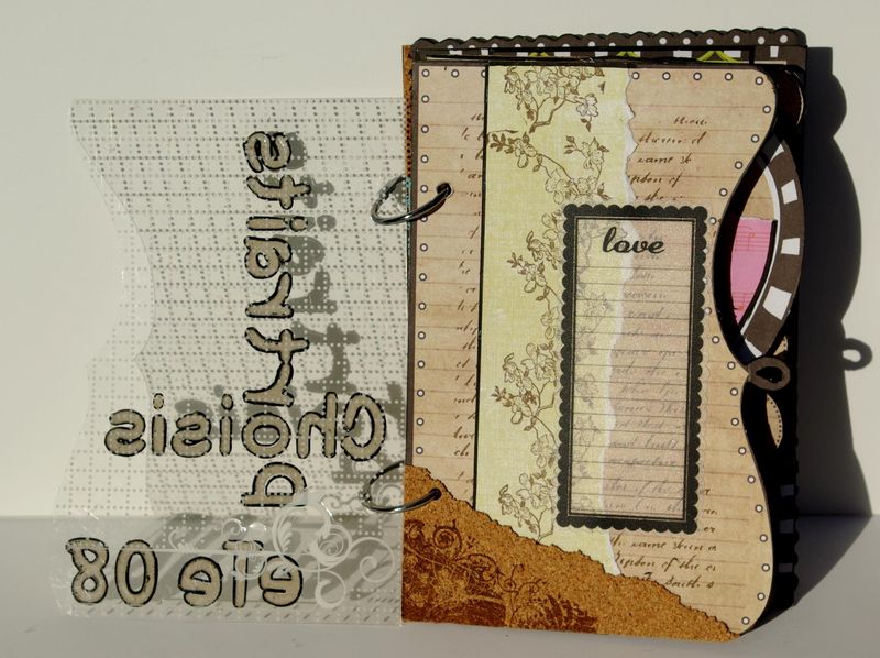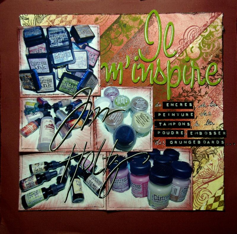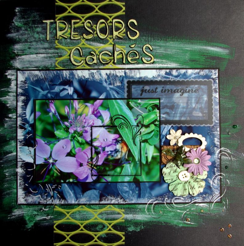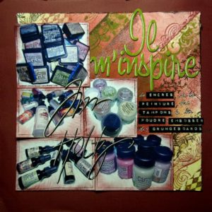 j’ai peinturluré le fond à l’accrylique, tampons Basic grey, chipboard et fleurs prima, transparent color conspiracy, cadre et étiquette maya road, un morceau de transparent Hambly (cadre sur la photo autour du bourdon) liège.