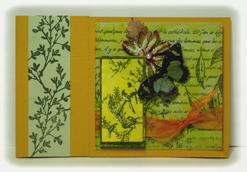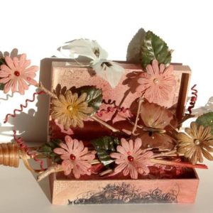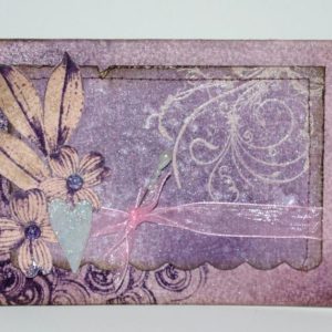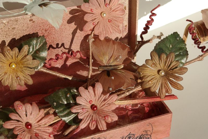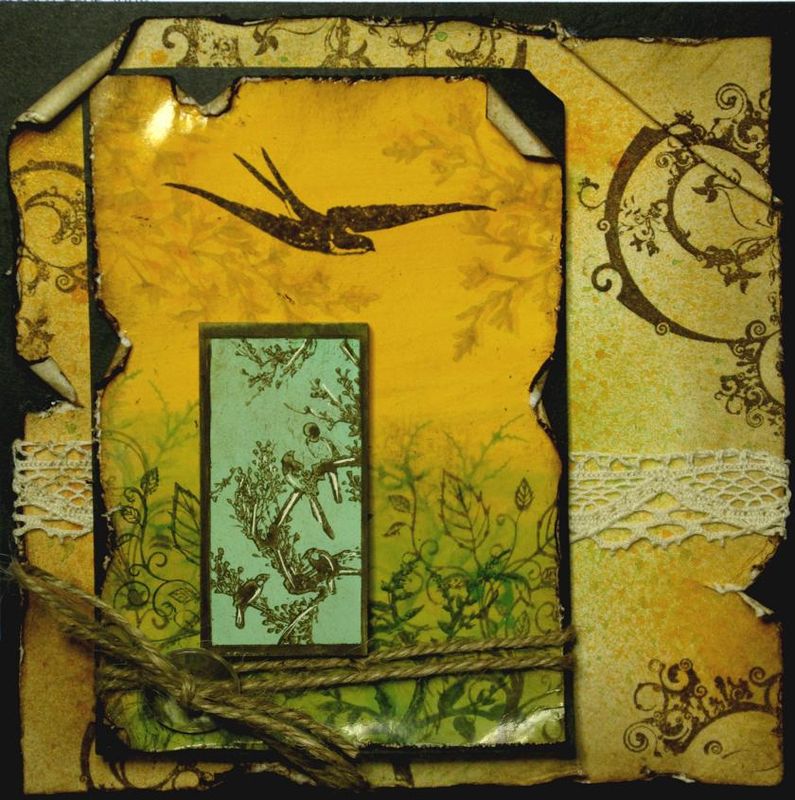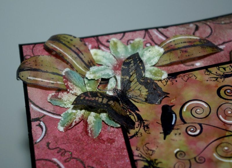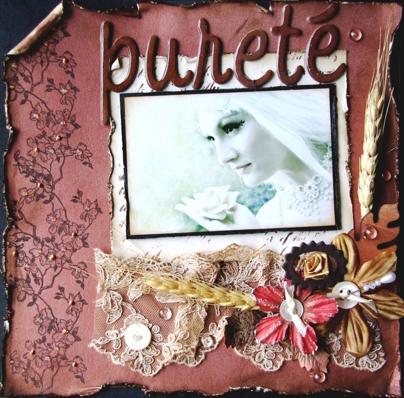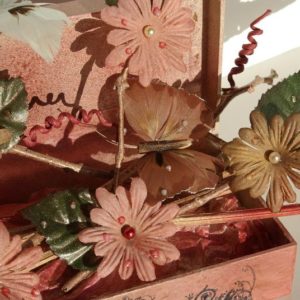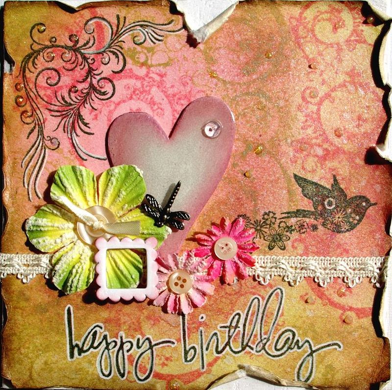 j’ai peinturluré le fond à l’accrylique, tampons Basic grey, chipboard et fleurs prima, transparent color conspiracy, cadre et étiquette maya road, un morceau de transparent Hambly (cadre sur la photo autour du bourdon) liège.
