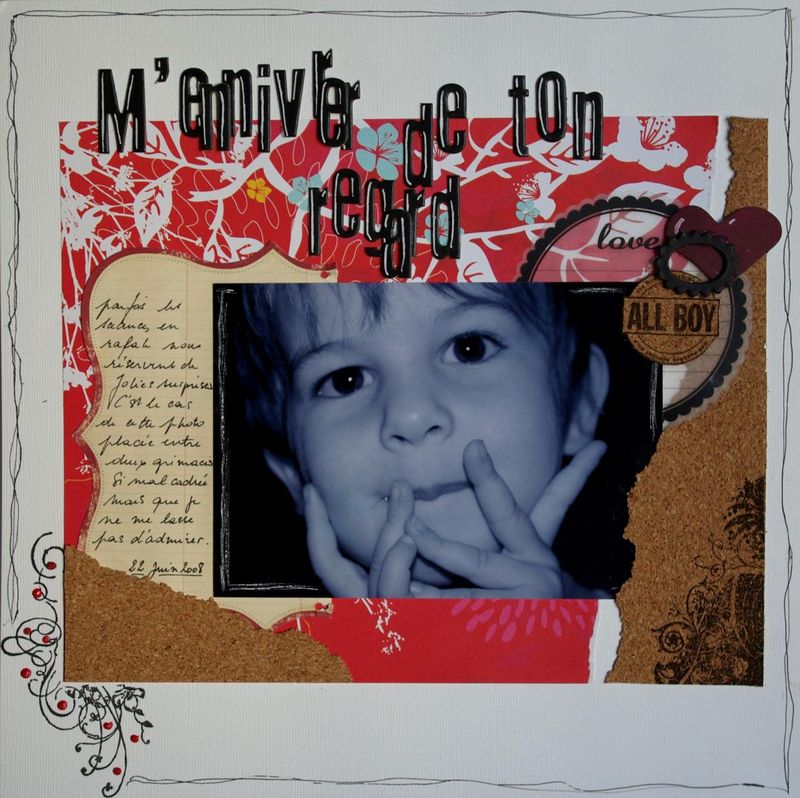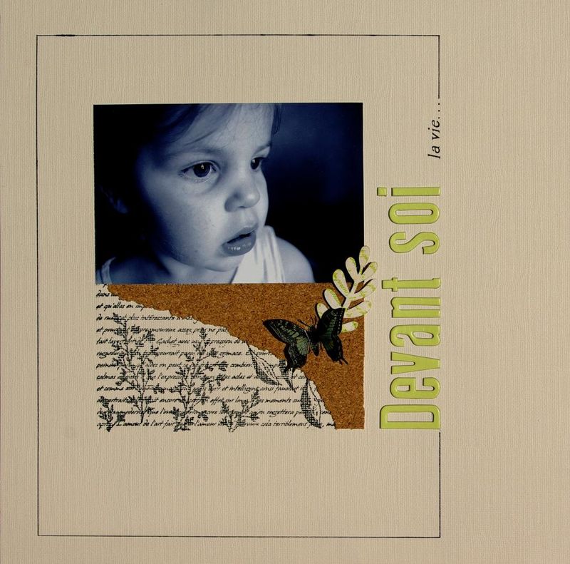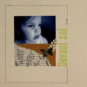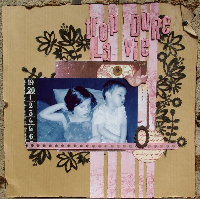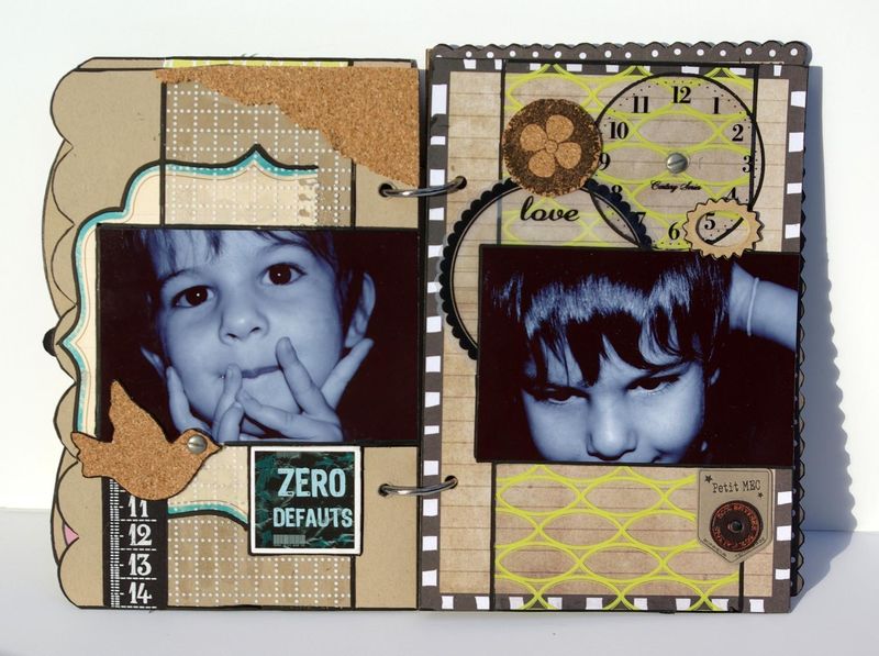 photo très saturée (bon, par rapport à ce que je fais d’habitude hein lol) papiers prima marketing, Rhonna farrer (je crois) scenic route, RDG, chipboards alphabet american craft, fleurs prima, étiquettes atilolou (la grande transparente en haut à gauche) et maya road (l’opaque) chipaboards maya road, perles de pluie, peinture 3D, Tampon Katzelkraft.