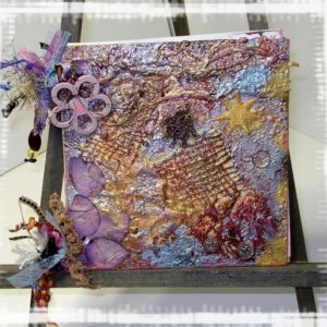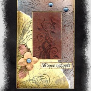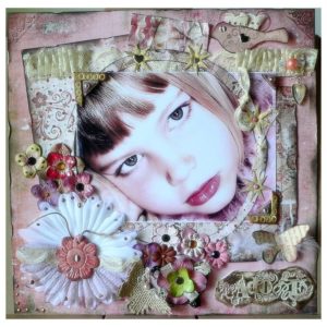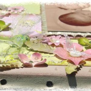 j’ai travaillé le fond avec de la peinture cracle old paper et j’ai légèrement encré dans un vieux rose.