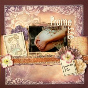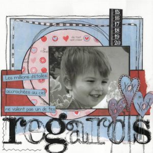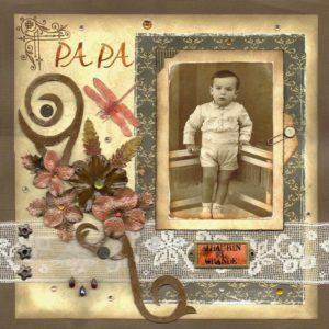 Apprenant que je faisais du scrapbooking, Dame Brigitte s’est mise à fouiller dans toutes ses accumulations d’années de chinage et à me faire passer des perles, de la dentelle, des boutons, des breloques que je sème sur mes pages avec un immense plaisir puisque ce sont des accessoires qui ont vécu.
