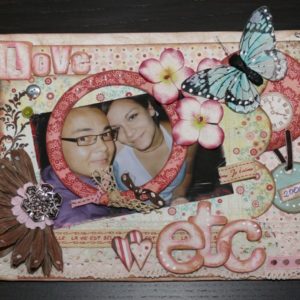 J’ai retravaillé les perles de rocaille, c’est un travail de longue haleine mais le rendu est tellement beau que je n’ai pas résisté, et une première pour moi sur une page de scrap, j’ai brodé des arabesques (sous les fleurs et entre les perles)