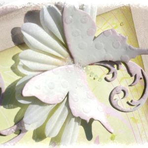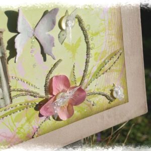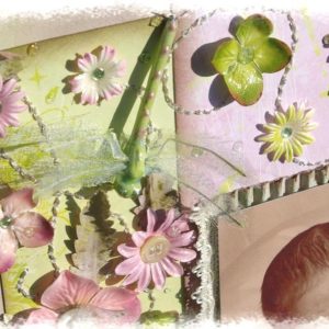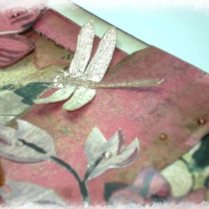 Papiers Rouge de Garance collection Lilou, fleurs primas et Heidi Swap, grungebords, carton pelé, libellule d’un rayon déco mariage que j’ai repeint (puisqu’il était bleu), du galon, des strass, des stickles, du glossy à gogo, bref ça brille partout 🙂