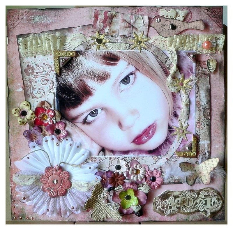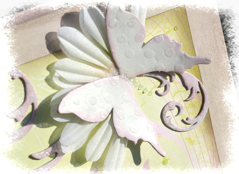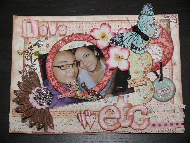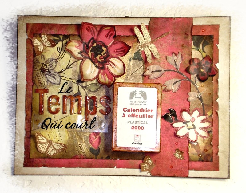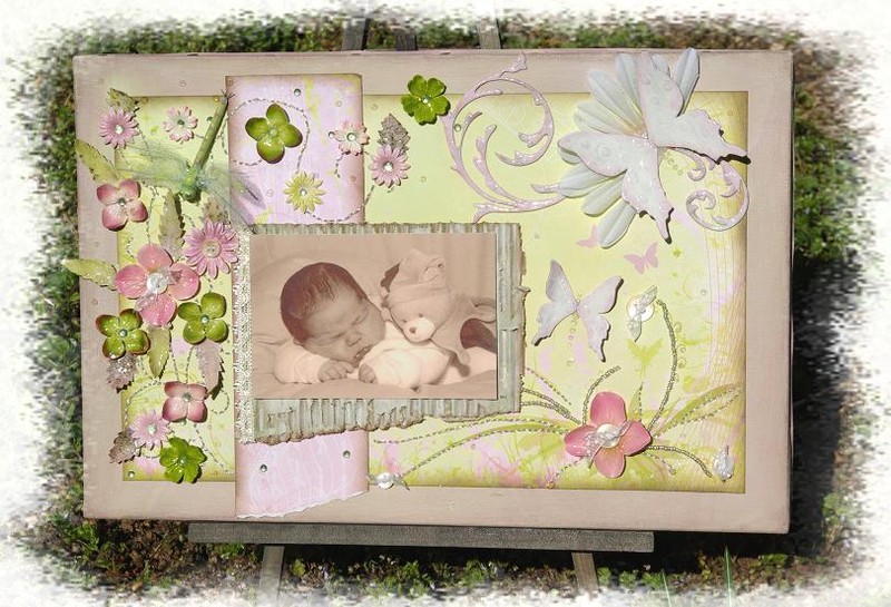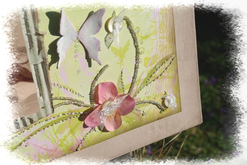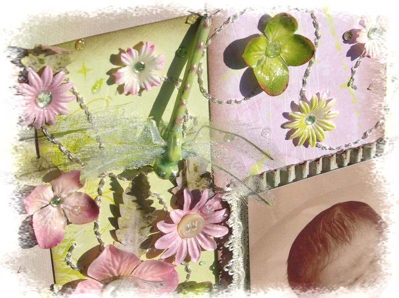Papiers Rouge de Garance collection Lilou, fleurs primas et Heidi Swap, grungebords, carton pelé, libellule d’un rayon déco mariage que j’ai repeint (puisqu’il était bleu), du galon, des strass, des stickles, du glossy à gogo, bref ça brille partout 🙂