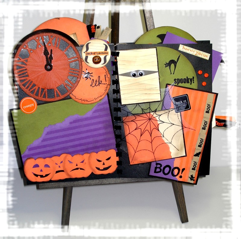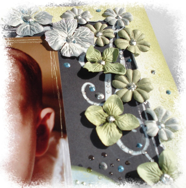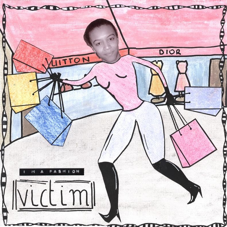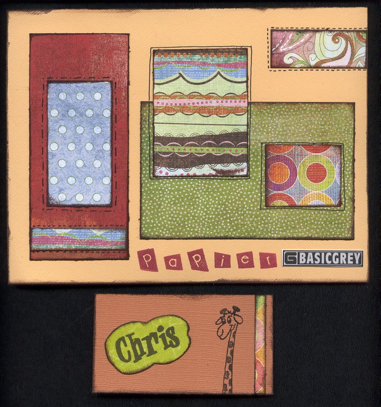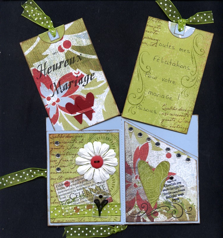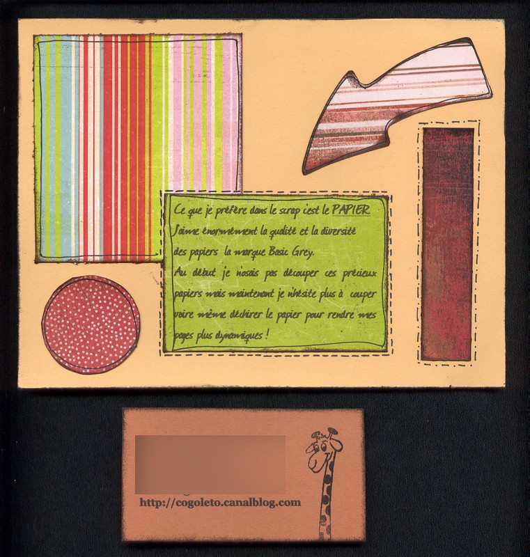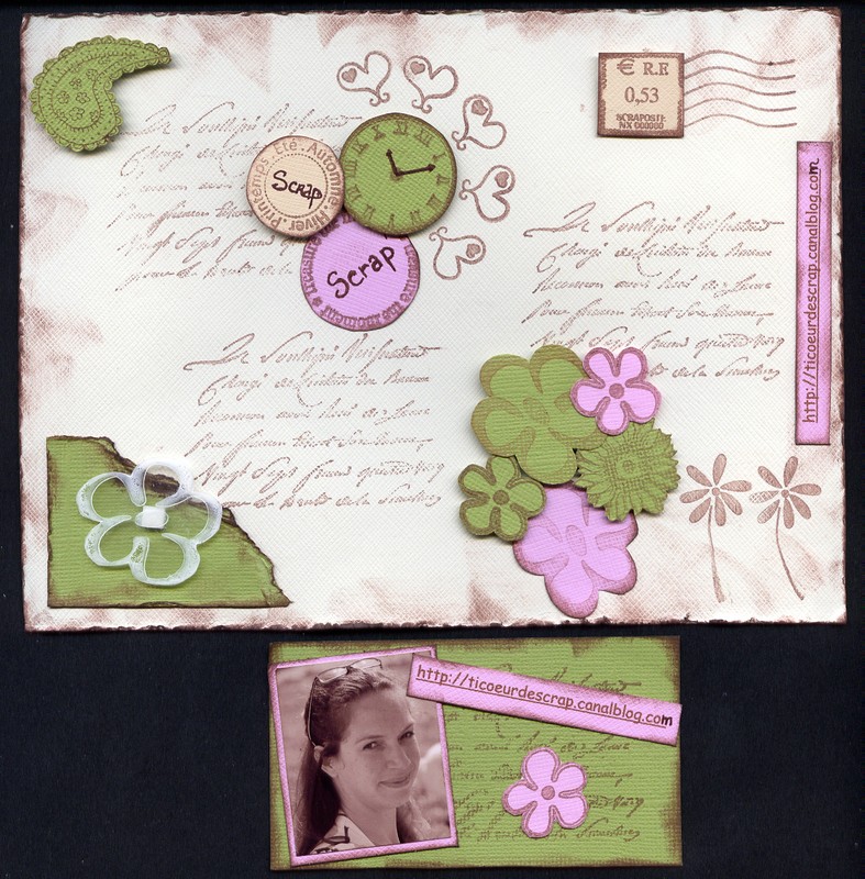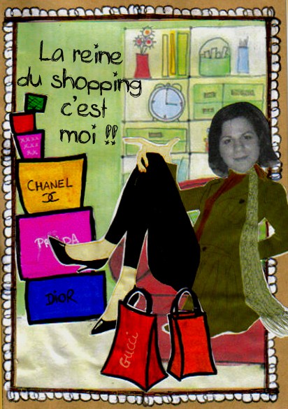 ah comme le format était libre et que malgré ma bonne volonté je n’y arrivais pas en format carte j’ai fait une carte 30 X 30 mdr !!! donc avec la photo de ma co-équipière… Thème choisi le shopping au féminin…